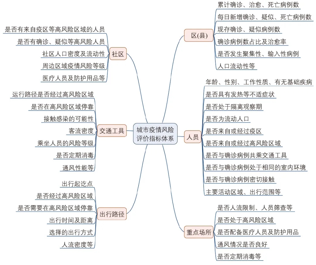 為了全方位掌握疫情發(fā)展狀況,城市疫情風險評價體系需涵蓋區(qū)(縣)、社區(qū)、人員( 包括流動人口)、重點場所( 如地鐵車站等)、交通工具、出行路徑等,要重點關注客流密度及人口流動性等指標,建立全面完善的疫情風險評價體系(見下圖),以支持城市交通決策。